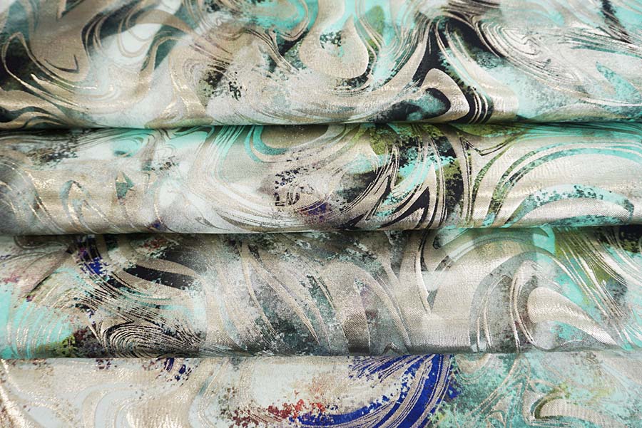 Questo prodotto è già stato inserito nella tua richiesta di preventivo.Jacquard con lavorazione lurex stampato